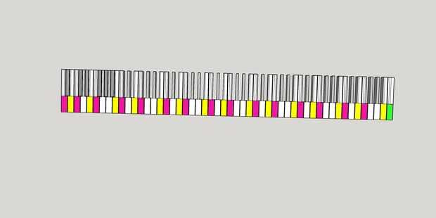 Sketchup fue utilizado una vez más el tamaño y forma de 52 teclas blancas el negro. Básicamente eran 4 figuras, como se muestra en la primera foto (color). Las teclas negras son simplemente rectangulares. Las claves sí son huecas para hacer la caja de luz. hoja de acrílico de 2mm fue cortada y había pegado entre las teclas.