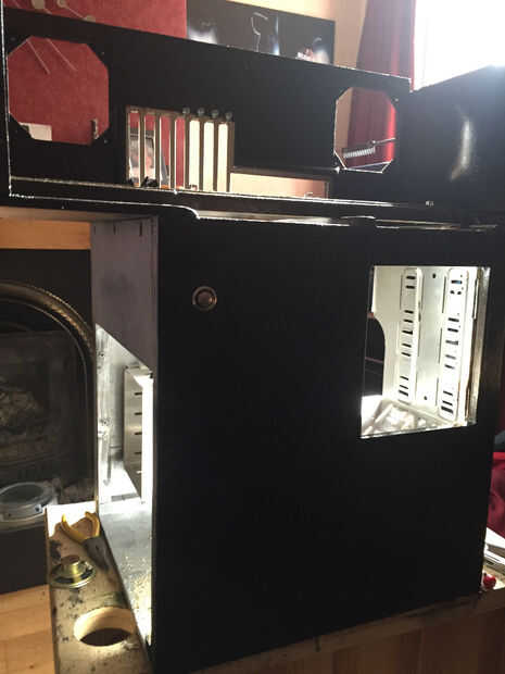 La vivienda es de 18mm capas. He pintado el interior con pintura de plata (parecía fresco). La potencia y luces de disco duro se montan en SUGRU y una pequeña barra de acrílico se perfora en la parte delantera.