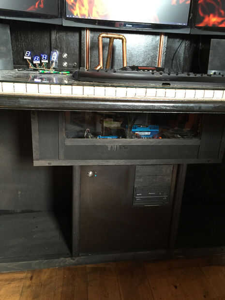 Construí la base de la que como mucho espacio como sea posible, esto dio lugar a una T en forma de caja para el ordenador. Había colocado en la idea de refrescarse de aire, no podía ejecutar a extra coste de refrigeración por agua, sin embargo yo quería ser capaz de actualizar si fondos permitieron en el futuro, espacio que era una prima. Tuve la idea de montaje de la placa plana en el centro de la mesa y tener un ventilador de 120 mm cada lado. El disco duro, unidades cd/blu-Ray, psu etc. escondido debajo. Fabricada la cubierta principal y me enruta a las aberturas necesarias para los fans y la bandeja de la placa base. Quería ser capaz de acceder a los componentes tan decididos de un cajón con frente abierto y una caja cerrada en la base. Tres ventiladores se utilizan en la base para proporcionar suministro de aire adecuado.
