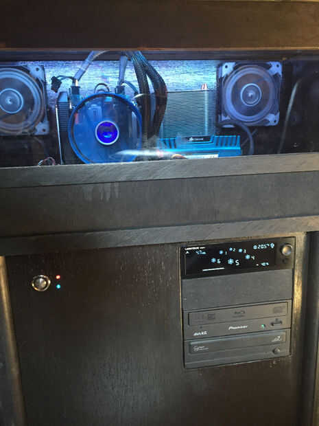 En cuanto a ruido, refrigeración por aire no ha sido ese problemático. todos los fans de cinco apuntan a la placa madre (controlador de ventilador pronto) y dando su abou 45db. (tranquilo que mi pecera). no parece haber ningún occilation a través de la madera.