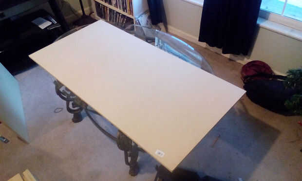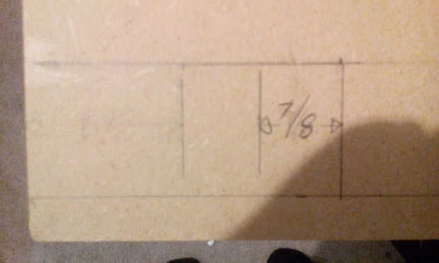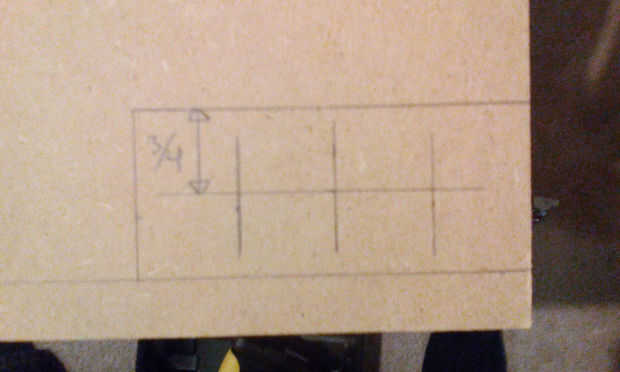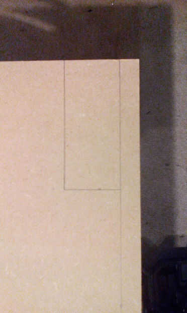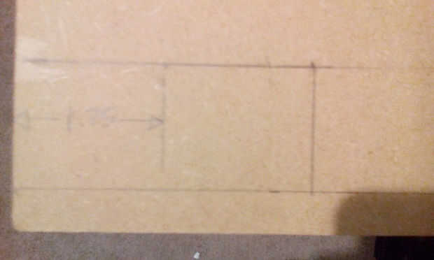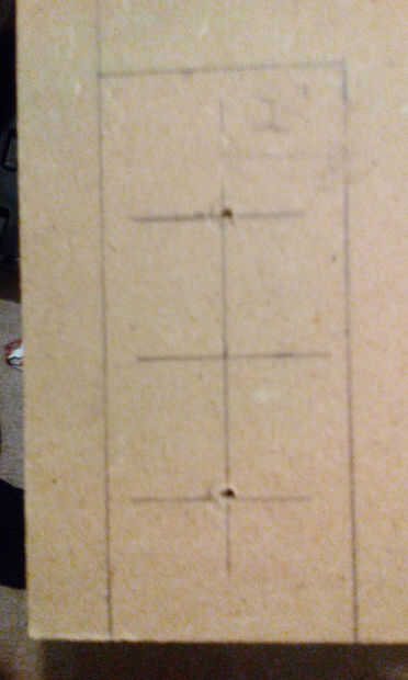 En las imágenes de arriba muestro que el MDF compré el escritorio se supone que 24 x 48 pulgadas pero resultó para ser de 24 x 49. Esto es fácil de solucionar. Si estás en la misma situación entonces todo lo que haces es hacer marcas de media pulgada de ambos extremos y trazar una línea recta que representa los nuevos extremos de la la mesa. Esto dejará una media pulgada más de cuelgue de los extremos de la mesa y que sea fiel a las dimensiones indicadas en la segunda imagen en la página de introducción. Luego sacó los rectángulos para las posiciones de montaje de 2 x 3 leg. La verdadera dimensión para aquellos que también está en las cartas de la mesa. 2 x 3 = 1.5 x2. 5 esto es lo que el tamaño del rectángulo debe ser, entonces encontrar el centro y los puntos medios. Entre el centro y los extremos son donde hacer sus marcas, como se ha visto en las últimas dos fotos arriba. Estas son para los agujeros guía. Debe repetir este proceso para las otras tres esquinas.