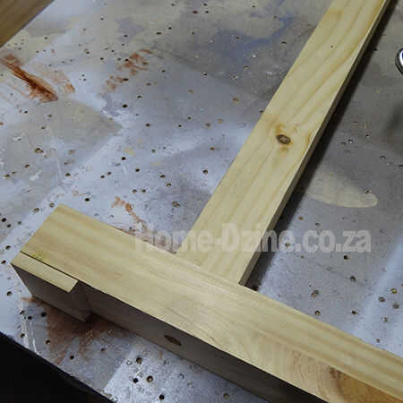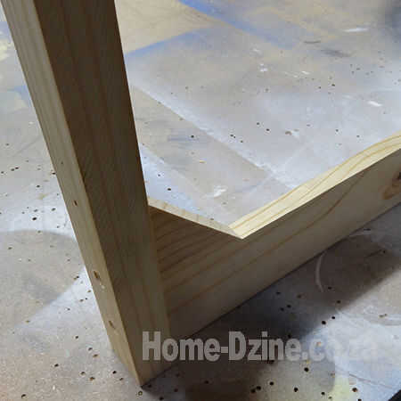 6. el respaldo debe ser cortado a la forma. Trace una línea por el centro para dividir en dos porciones ancho de 75mm. En una sección medida y marca en 75mm y corte un ángulo de 45 grados.