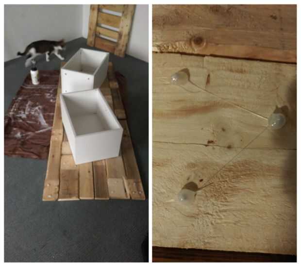 Sobre una superficie plana poner dos tablas al lado con el lado superior de la madera hacia el suelo (esto significa el escritorio es mucho más plano).
