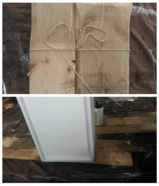 Poner pegamento de madera en el borde de una tabla y palo al lado del otro. Uso de string tie los dos tablones firmemente juntos. Poner algo muy pesado en las tablas y dejar secar durante unas horas.