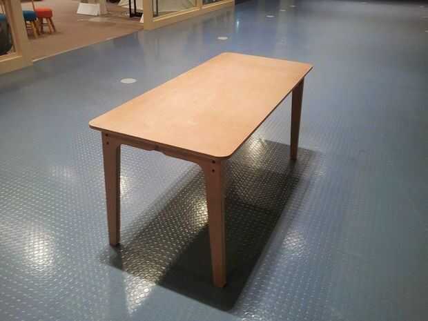 Para cada pierna, dos partes (externas/internas) se unen con pegamento para madera para aumentar la rigidez. Y luego se unen cada dos piernas junto con un conector de cola de Milano. Esto es para encajar todas las piezas dentro de una hoja de madera contrachapada sola.