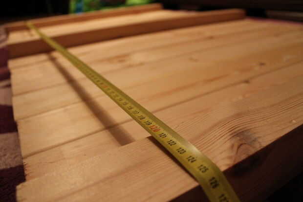 Medir todo para calcular todo el proyecto. Mi cada tablero tiene 9cm de ancho, tendrá en frente 3 vigas principales (los 5x5cm) por lo que será 12 tableros x9cm + 15cm (vigas) = ~ 123cm de longitud y: ~ 64cm de ancho (los 6x9cm + 10 cm)
