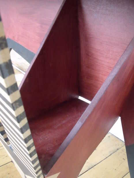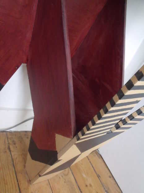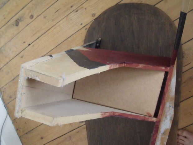 Fijar las piezas del dos cuello en el lado de la cabeza con cola para madera y clavos. Montar el poco. Nota: el lado 17 cm entra en frente, el lado de 14 cm en la parte posterior. La plataforma también es pegada y clavada. Compruebe si la parte posterior del cuello puede estar parado vertical (en una pared). La parte del cuerpo debe hacer un ángulo de 90 grados en el suelo. Con mi escritorio hay un hueco pequeño en el extremo de la plataforma porque hice la brecha entre las patas delanteras en el cuerpo unos pocos centímetros de alto. Las mentes de nadie...