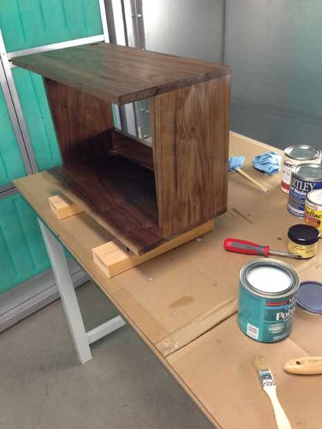 Apliqué el polycrylic con un pincel y dejarla secar durante la noche. Entonces repetí el lijado y la aplicación de medidas polycrylic para un total de tres capas.