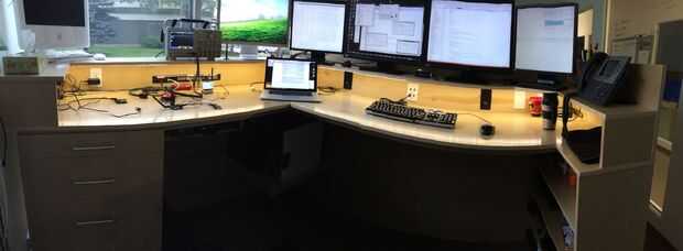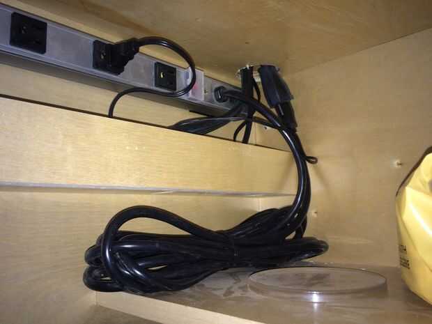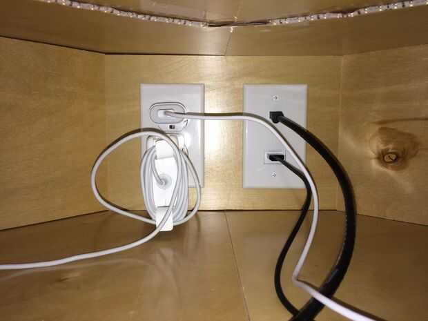 Para mi mesa, quería realmente buena electrificación - esto no significa cables tocando el piso, sin cables detrás del escritorio, sin cables en la superficie del escritorio, etc... Diseñé una cavidad debajo de los monitores donde podría correr energía, cables de monitor, cables USB, etc..