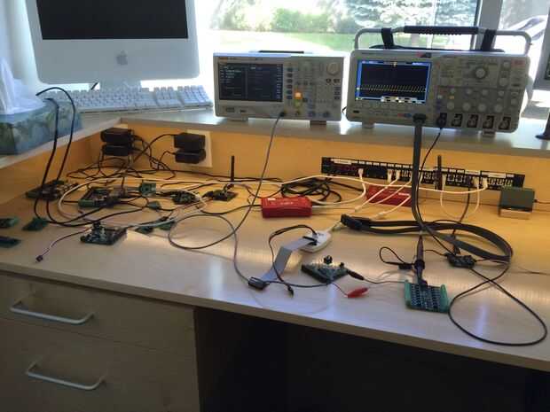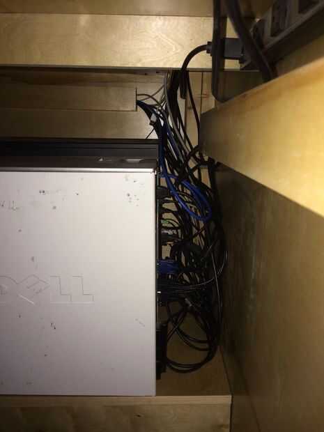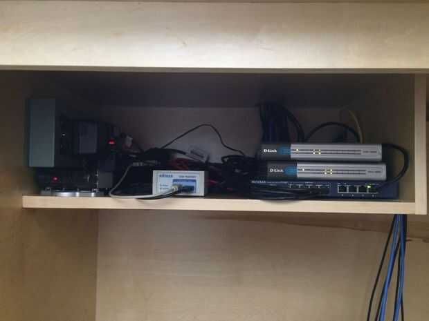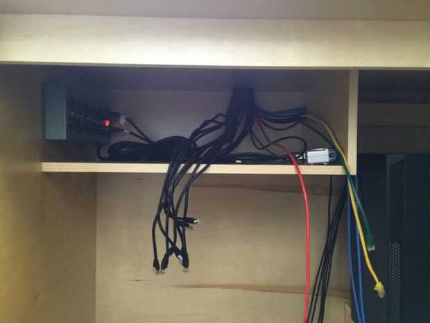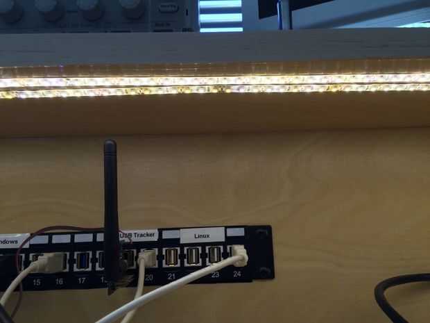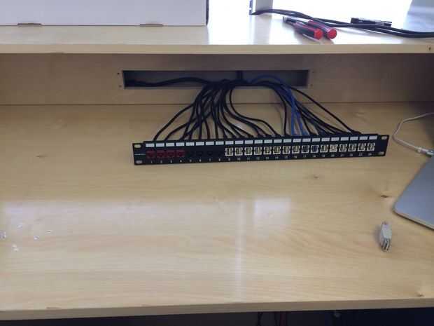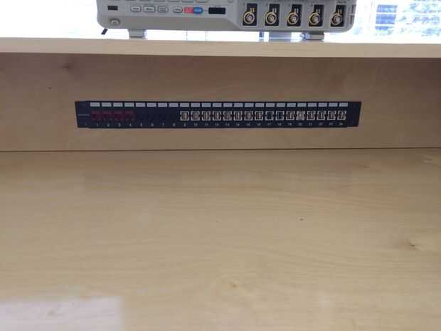 Puesto que el diseño de hardware de red y USB para ganarse la vida quería fácil acceso a un montón de puertos USB y ethernet en mi escritorio. Agregué un estante bajo el escritorio para USB hubs y conmutadores ethernet y añade un panel de parcheo de 1 x 24 al escritorio - en la que inserté una selección de USB y CAT-6 jacks keystone.