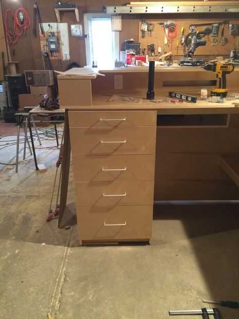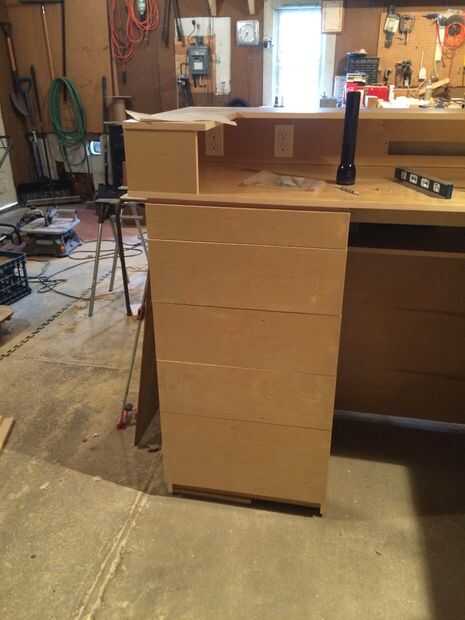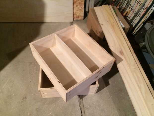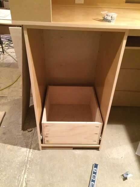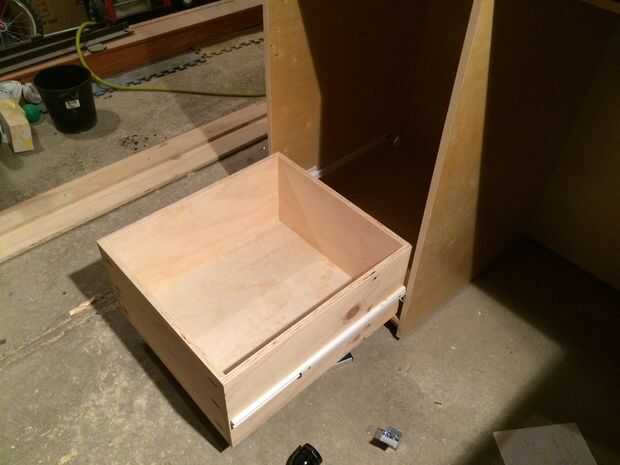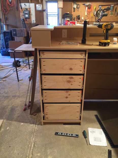 Cajones muy básicas- pero esto es la primera vez que yo había hecho cajones. El tornillo del agujero de bolsillo son realmente perfectas para construcción de cajón. Usé algunos 1/2" madera contrachapada de pino tenía por ahí de los cuerpos - con 1/4" para los fondos de arena. Para las diapositivas, me decidí por extensión completa bastante resistente. También he añadido algunos divisores de algunos de los cajones.