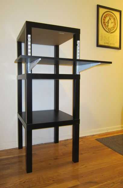 Lo bueno es que puede cambiar la altura del estante del teclado/del ratón simplemente bloqueando los soportes en un lugar diferente en los montantes. Sin embargo, el ordenador portátil/monitor va encima de la mesa superior y esa altura es fija. Estoy un poco más de seis pies de altura y la altura de la mesa de pie es la correcta para mí. La solución humana proporciona una calculadora que calcula la altura de estante y Escritorio ergonómico teclado/ratón para usted. Dependiendo de su altura, puede reducir las patas de una mesa o apilar las latas mesa superior de la tabla superior en la parte superior (Arizona), platos de carta, lo que sea. Si usted necesita un escritorio más, tratar de apilar tantas bandejas de carta que usted necesita sobre la mesa y cubre con uno o más estantes de IKEA EKBY LAIVA (1,99 USD por estante).