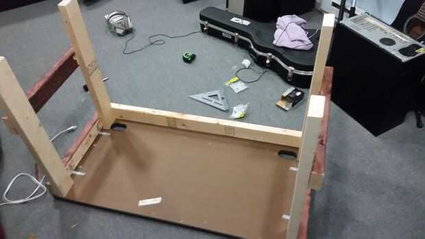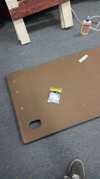 Traje en las piezas cortadas desde el garaje en el sótano, una decisión tomada por pereza, no quiero llevar en un escritorio completo. Usé pegamento para madera y tornillos de 3"(que tenía en el garaje) para montar a las piernas, una vez que se puso la parte superior de la mesa hacia abajo y comenzó a montar directamente en la parte superior. Construí un escritorio en la parte inferior a la superior poner que la parte superior por último, pero sólo quería sacudir las cosas en el segundo escritorio.