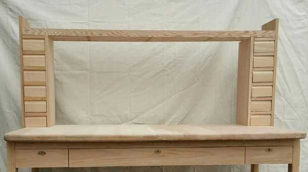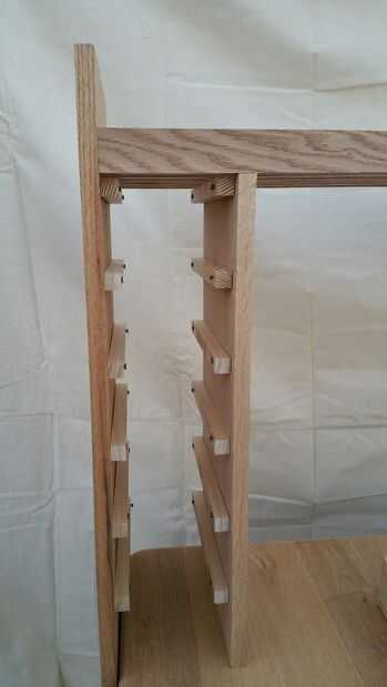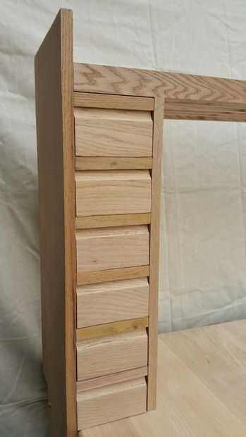 Como se ve en la foto 9, los cajones verticales se intercalan entre dos placas paralelas, de 12 pulgadas (305 mm) de ancho y 24 pulgadas (610 mm) de altura.75 pulgadas (19 mm) de espesor. Los cajones se apoyan sobre rieles horizontales que se unen a los lados como se ve en la foto 10. Los rieles son de.75 pulgadas (19 mm) de ancho y alto y 10 3/8 pulgadas (264 mm) de largo. Los rieles se fijan detrás.75 pulgadas (19 mm) y están espaciados de 3,25 pulgadas (83 milímetros) aparte.