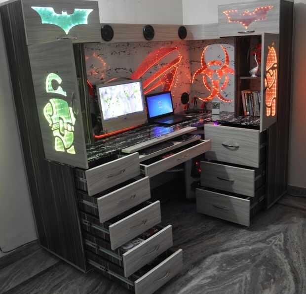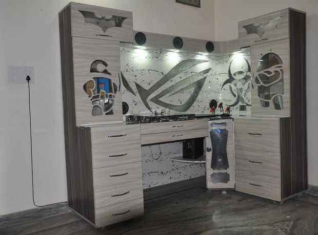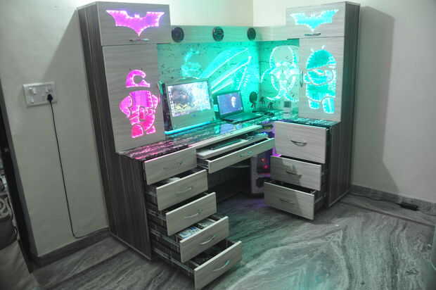 Este es mi sueño Custom PC de escritorio y la idea de construir este escritorio es inspirado. Este escritorio es hecho por mí y mi hermano (Ashish Kumar) y hemos tomado casi 48 días. Hemos terminado este proyecto en septiembre de 2015, pero en aquel momento no estoy familiarizado con Instructable es por eso que no se puede subir nuestro trabajo en aquel momento. Esta tabla hemos hecho en nuestra casa no en la tienda y esta tabla es puramente hecho cada Logo es hecho a mano con la ayuda de una sierra caladora. Estamos en busca de algo diferente pero en medio del proyecto hay un montón de retos que hemos enfrentado. Realizamos todas las instalaciones según nuestra necesidad. Esta tabla tiene construido en altavoz, monitor de espacio de almacenamiento enorme cubierta también es de encargo si no está usando a continuación, usted puede colocar monitor, sentado le siente con RGB led que está sentado en una estación de juegos de azar y Carnaval comienza, un sentimiento hermoso sentado en esta mesa. Esta tabla se realiza mediante tablero de capas de material y tamaño de la tabla es uno cosa de 7'X 4' en la que no somos perfectos es hacer video. Trabajo muy difícil rodar con ángulo diferente porque pierdo mi enfoque durante el trabajo siempre molesto estas thing.so perdon por la mala calidad video.but debo ver para que usted pueda entender nuestro trabajo duro.
