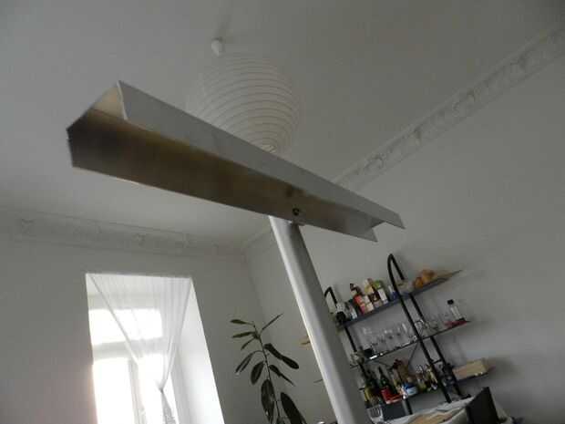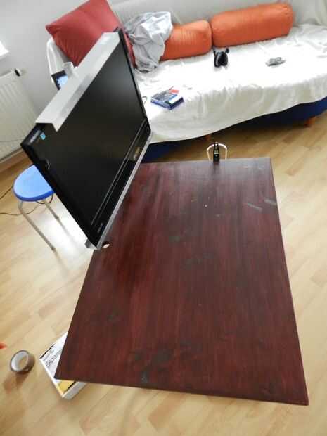 Hacia arriba de la mesa, tomar las medidas de su altura de monitor y perforar un par de agujeros para atornillar firmemente los perfiles horizontalmente y paralelos uno al otro para mantener al monitor en el medio.
