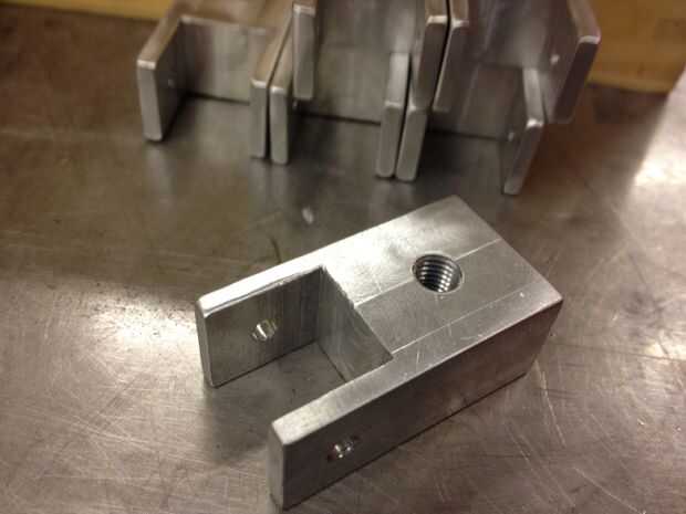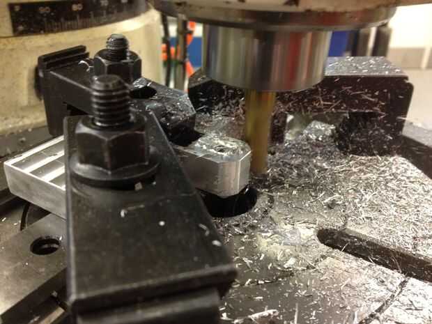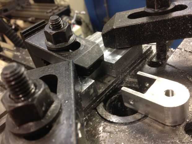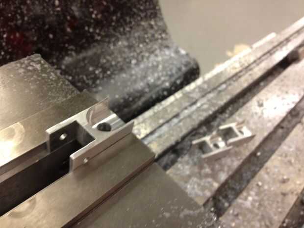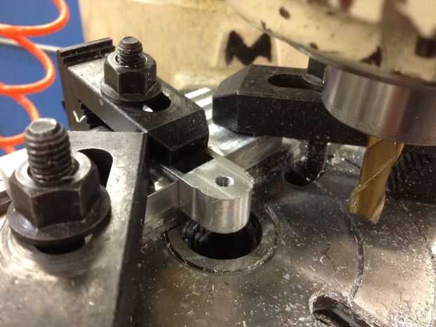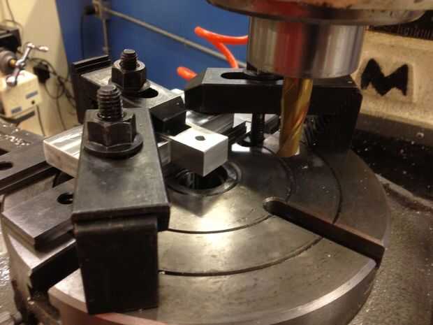 En segundo lugar fue hacer las articulaciones de pivote en el molino. Cada articulación tiene dos piezas: una para el botón para insertar y el otro para sujetar el botón. I había molido mis bloques de aluminio a la medida exacta, cortar ranuras para las extrusiones a, para la extrusión de piezas para el montaje y el botón para ir a través de agujeros perforados. Para las piezas que mantenga presionado el botón también que una sección circular usando la barra aburrida para el botón para sentarse a ras con la superficie superior de la articulación pivote del molino. Por último usar la mesa giratoria para redondear los bordes de las piezas de empalme de pivote. (Yo también trabajada a máquina un jig para sostener las piezas al usar la mesa giratoria)
