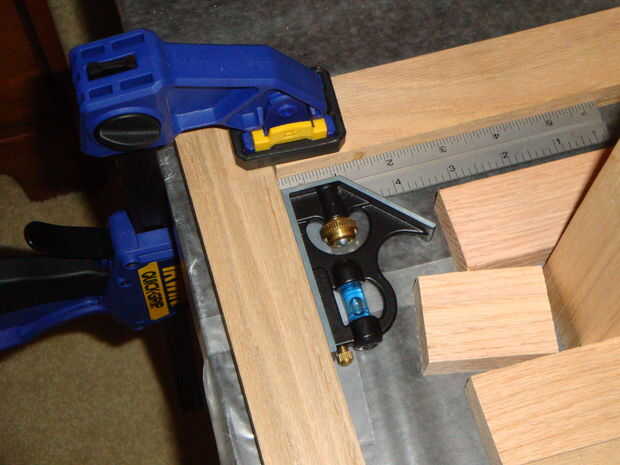 Mi primer pensamiento fue configurar un borde recto en un extremo de mi mesa de trabajo y utilizar este borde para alinear los diferentes consejos. Al final he creado una esquina completa que ha demostrado para ser muy útil cuando pegar las piernas.