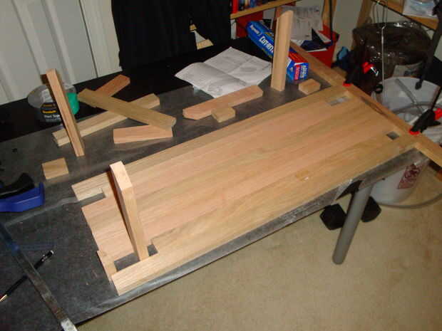 Una vez terminados los cortes, diseño de la madera en su superficie de trabajo y realice un ajuste seco consulte con todas las piezas. Se trata de una forma rápida y fácil para asegurarse de que no erraron. También es un buen momento para trabajar exactamente como usted se se sujeción el escritorio mientras pega. El método depende de que las abrazaderas están disponibles - ya que no tengo ningún pinzas que pueden alcanzar a lo largo de la mesa que tenía que ser creativo.