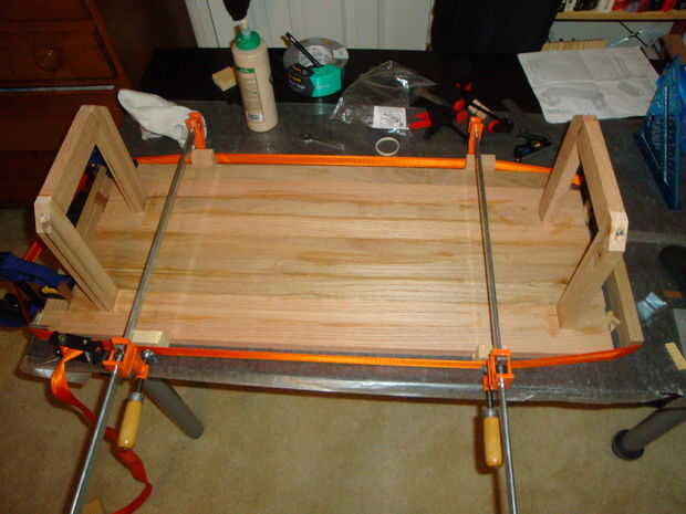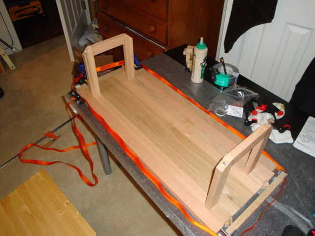 Una vez que las piernas han secado completamente es el momento de montar el escritorio completo. Colocar cada pieza una a la vez, aplicar pegamento a medida que avanza. No te asustes! Tienes un buen 10-15 minutos que todo arreglado antes de que el pegamento se endurece. Puesto que esto es falso butcherblock estilo tabla, tiene que haber una fuerza de compresión aplicada en ambas direcciones. Puesto que no propia abrazaderas tiempo suficiente para que la longitud de esta mesa, utilicé una combinación de una correa apretada de raqueta y abrazaderas de madera regulares.