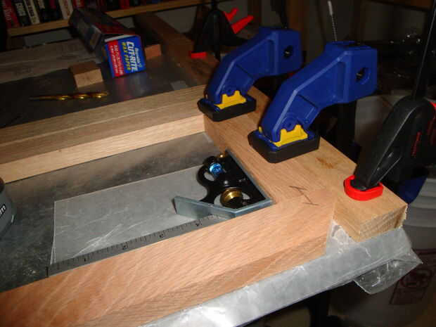 Mientras estaba viendo las piernas secas se preocupó de que el enlace de la cola entre las piernas no sería lo suficientemente fuertes como para soportar el peso de la mesa. No sé por qué pensé esto, ya que un) pegamento Titebond es ridículamente fuerte; Nunca lo he visto separado y b) el peso se lleva hacia abajo a través de las piernas y directamente en el piso-el lazo de cola a los pies de las patas no debe ver casi carga. De todos modos, he decidido solucionarlo colocando tornillos a través de las patas diagonales. No recomiendo este enfoque - es difícil atornillar a través de roble y difícil para que se vea buena epílogos.