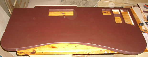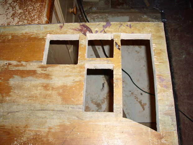 Ahora corte los orificios para la sección de organización, como se muestra en la fotografía. Sólo perfore un agujero en algún lugar, poner el juego en y cortar el resto. Si usted tiene una fresadora, puede usarlo para los agujeros 3 y 4 - que realmente poco profundas de todos modos basta (3 - alrededor de 2,5 cm, 4 - 1, 5 cm). No tengo la máquina, por lo que recorto y luego equipadas tablillas debajo para que un fondo. De nuevo, utilice papel de lija para suavizar los bordes.
