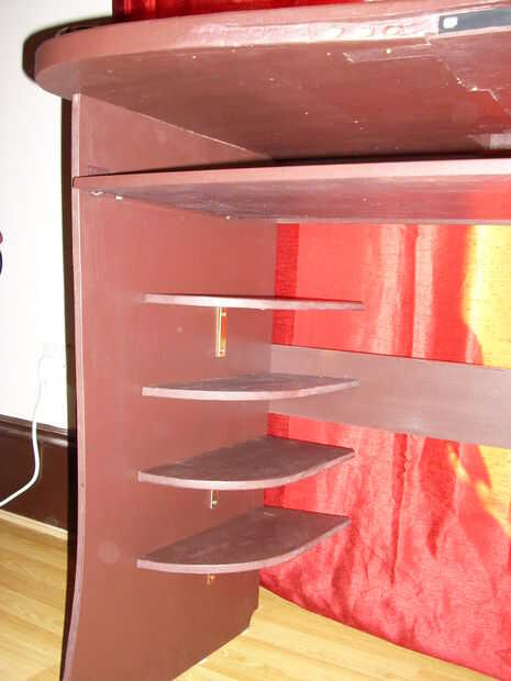 Una vez que cortes las juntas, sujete a la pierna izquierda de la mesa con 2 clavijas y un apoyo de la esquina. Por desgracia esto compromete las miradas un poco - usted puede ver el elemento de construcción, pero la única alternativa que he pensado era utilizar tornillos más largos, y esto significa perforación a través de la 'pierna', que también será visible. En la práctica, sin embargo, las abrazaderas de las esquinas son apenas visibles de todas formas (hay que arrastrarse por debajo de la mesa a ver, realmente, sobre todo cuando existen los CDs), por lo que no es tan malo.