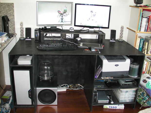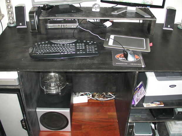 El escritorio tiene juntos muy bien y me muevo alrededor un montón cuando tenga que lidiar con el desorden de cables detrás de él. No sólo hace sujetan bastante bien (he levantado en varias ocasiones), pero puesto que he construido para caber las cosas específicas en cada estante, todo tiene un lugar muy agradable.