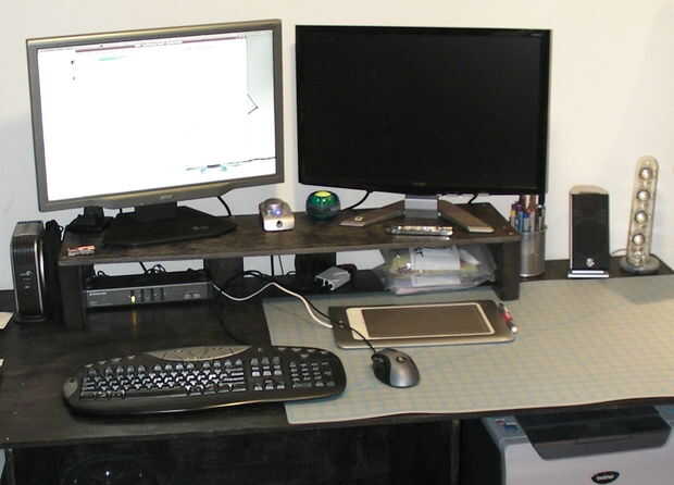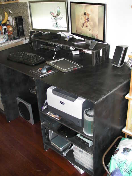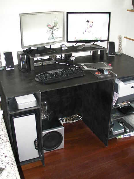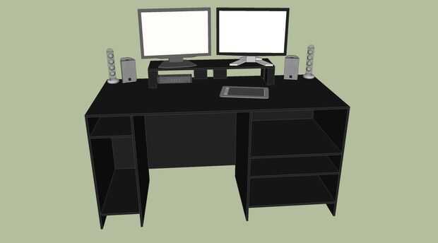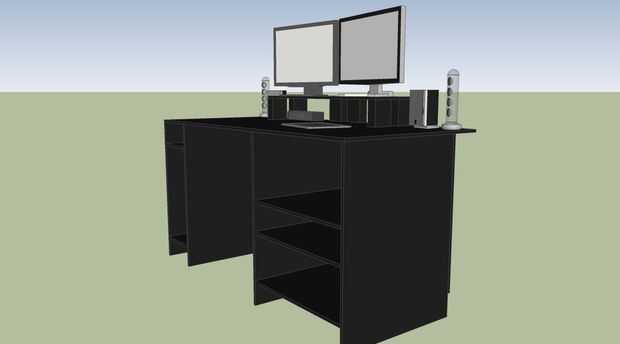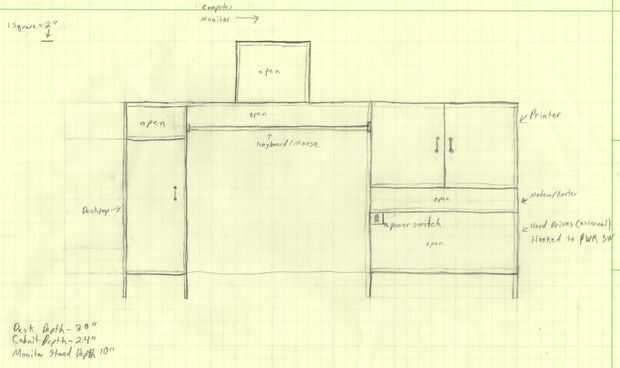 Que bosquejar mi escritorio en papel cuadriculado primero (a escala). Entonces construí el escritorio (menos puertas y soporte de monitor). Pasé un semestre completo con un escritorio monitoreado bajo. Después el semestre bosquejó mi escritorio en SketchUp y comenzó a modelar cosas en el escritorio, por lo que pude averiguar de cómo organizar las cosas. Finalmente había averiguado mi altura del ojo y modeló el soporte de monitor, luego construyó.