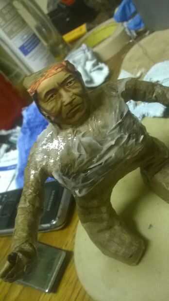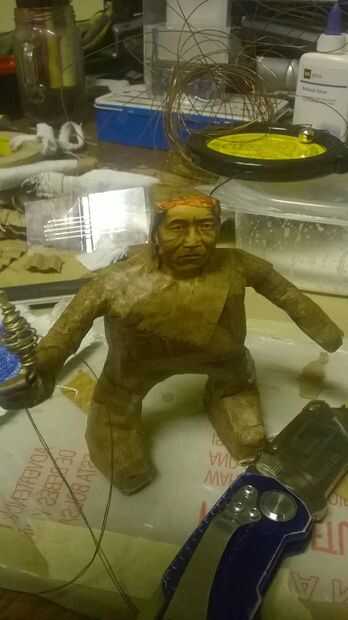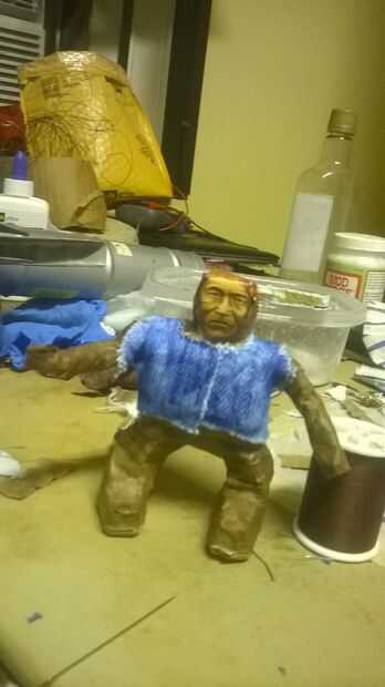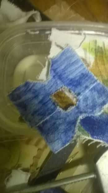 2) sabía que yo quería que usar ropa debido a la estética desgastada agregaría. Corté algunas formas ásperas para ver cómo se unieran. Cuando tuve las dos piezas que cubren su torso suturan les. Luego le había recubierto con silicón y masajear a la tela en ella. Lo dejo curar mientras trabajé en las mangas de la chaqueta y los pantalones.