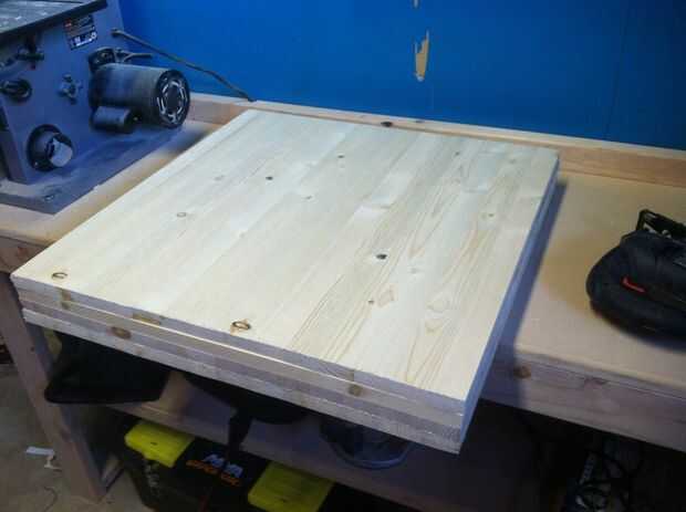 A continuación, utilizando una sierra de calar, corté dos hojas por la mitad, dejando 4 piezas de 2' x 2' plazas.