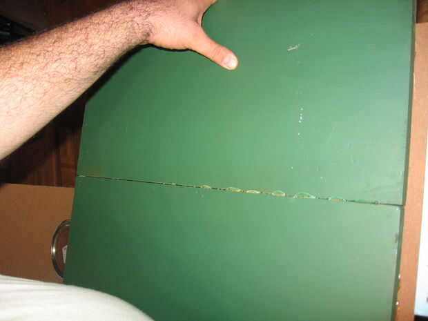 Haría cualquier pedazo de madera u otro material, realmente, pero como mi objetivo aquí es un proyecto que es casi todo reutilizados materiales, pegué una vez más el ático. Había varios gabinetes como el que estoy trabajando aquí, y robaron dos estantes de uno de ellos para crear una superficie de trabajo. Por un lado de los estantes, apliqué pintura de pizarra. Por otra parte, apliqué una superficie de pizarra rescatado usando pegamento caliente. Aunque la superficie viene en dos piezas, es ser sostenido togerther por el pegamento y por la pizarra del forro.