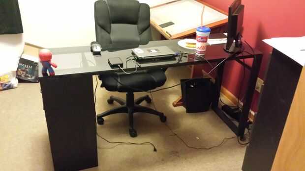Este escritorio se puede hacer por unos 30 $, digno de madera, un pedazo de cristal de Ikea (transparente gris Malm vidrio parte superior, 18 7/8 x 63 "), algunos tornillos y algunas pinturas. Sobre el total de $70. El marco es extremadamente ligero pero muy robusto con la parte superior en ella.