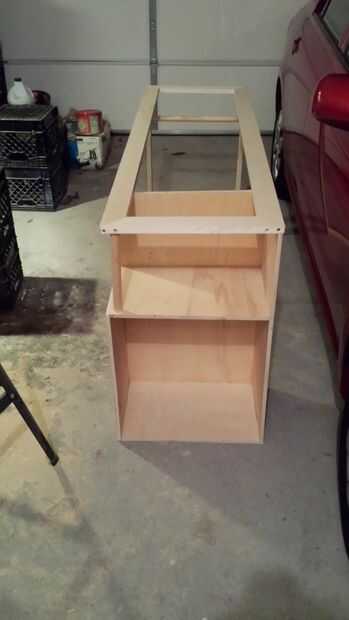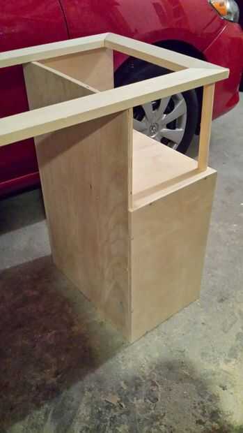 La caja de la caja se forma con todas las piezas de madera contrachapada, excepto los 11 3/4 x 18 1/2" pieza. Utilizando la imagen como referencia, la parte de atrás es 19 x 30", el lado izquierdo es 12 x 22", la parte superior e inferior son 12 x 18 1/2" y el lado derecho es 12 x 30". Encolar y atornillar las piezas.