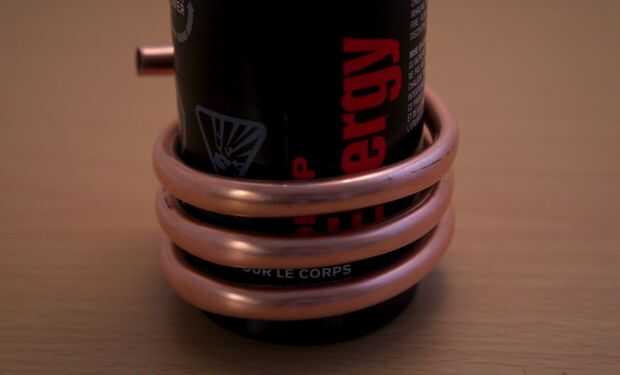 El juego pasado y casi más difícil fue doblar la bobina de cobre. Si usted intenta y dobla la bobina con la mano (o alrededor de una forma) usted verá rápidamente que el tubo se doble. He intentado llenar el tubo con arena que funciona muy bien pero es muy difícil conseguir la arena para verter nuevamente teniendo en cuenta su pequeña ID. Finalmente colocado en la sección de la tubería de llenado con agua y prensar los extremos cerrados. Después cuidadosamente doblado el tubo con la mano para que coincida con la lata de aluminio y utiliza la rueda del cuttoff recorte los extremos y quitar el agua. Mientras que esto trabajó bien tiene que haber una manera más fácil.