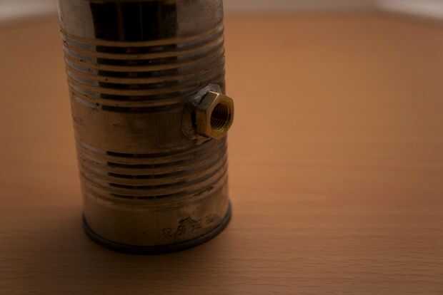 Una vez que el contenido de su puede retirar taladra el agujero 3 como el agujero de llenado.  Opté por usar una guarnición de cobre amarillo pequeño y toma adecuada para abrir y cerrar la caldera fácil.  Una vez que taladro este 3er quiere asegurarse de que el interior de la lata es tan limpio como sea posible ya que esta es la última vez que usted tendrá fácil acceso al interior.  Después de dimensionar mi agujero a mi conexión dio la guarnición de cobre amarillo y el orificio una luz lijado basto hasta la superficie para hacer soldadura fácil.  Atornille el accesorio en la lata y aplique una pequeña cantidad de flujo para mantener la articulación de oxidantes.  Calentar la guarnición de cobre amarillo más gruesa y luego la lata hasta que fácilmente puede fluir la soldadura en la costura.  Una vez más todas las juntas deben ser herméticas así que tómate tu tiempo y hacer un trabajo limpio.