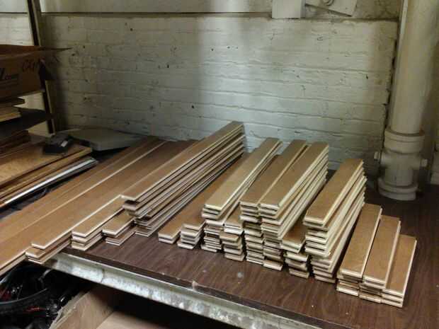 Nos pareció más fácil de ordenar nuestra madera de longitud por lo que podemos encontrar piezas que cerca nuestro diseño. Esto permite menos corte y menos desperdician material. Porque las piezas tienen lengua y ranuras para end-to-end, así como en los lados, queríamos las piezas enteras más largo de los bordes de los paneles para asegurar fuerza y estabilidad, mientras que para los centros podríamos coincidir con piezas más cortas y acóplelos fácilmente.