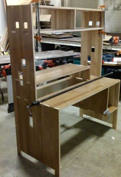 - Una vez que el escritorio se atornilla juntos, compruebe para asegurarse de que es cuadrado, entonces ajuste los paneles posteriores y taladre y atornille en su lugar.