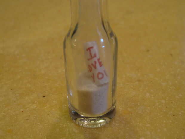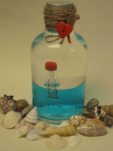 He utilizado botellas de vidrio pero se puede utilizar plástico, que realmente puede flotar. Si la botella pequeña puede flotar podría saltar el paso de la cadena. Asegúrese de a peso la botella pequeña con suficiente arena flotar a un nivel adecuado.