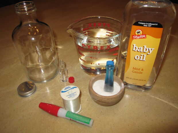 2 botellas -1 lo suficientemente pequeño como para caber dentro del otro; Etiquetas de quitar, lavar y secar. (Yo usé una pequeña muestra de Tabasco para la pequeña y una botella de sal de mar para los grandes).