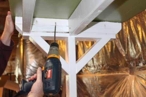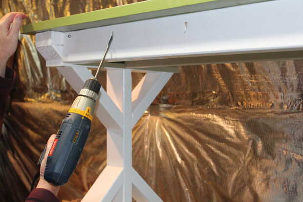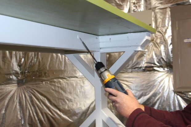 Fije utilizando los taladros del agujero de bolsillo. Tenga en cuenta que pueden utilizarse tornillos o clavos en lugar del método de accesorio pocket hole jig. Sólo contra los agujeros del fregadero y usar masilla para madera para cubrir los agujeros.