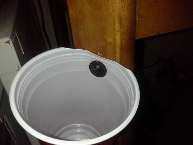 Ahora antes de empezar a atornillar, la Copa tiene un borde alrededor de la tapa que podría impedir la Copa sentado al ras contra la pata de la mesa escritorio. Así que lo que hice fue recorte parte de la llanta con un par de tijeras (ver foto 1). Ahora que estamos listos, poner la arandela en el tornillo y enrósquelo a través del orificio de la Copa. Lo siguiente es si o no desea que su copa en un ángulo como la mía y si eres feliz con eso comience girando ese tornillo lentamente en el escritorio/mesa con el destornillador hasta que esté completamente en.
