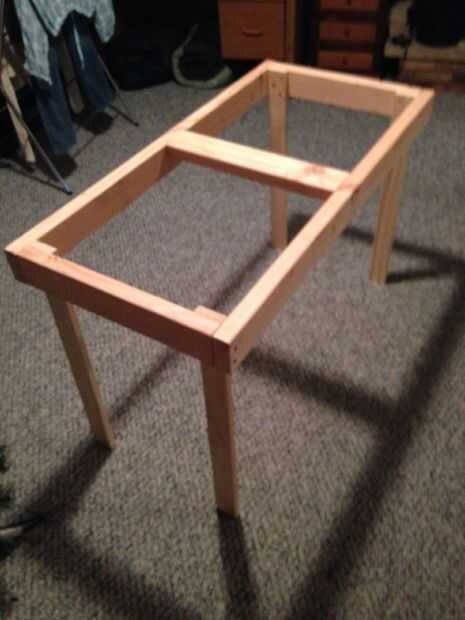 A continuación, crear la carcasa de la caja. Abrazadera 2 "x 4" s juntos por un extremo es aún. Corte el otro extremo a 45 pulgadas de ambas tarjetas al mismo tiempo. De la misma manera, cortar las restantes 2 "x 4" piezas de 19.5 pulgadas. Abrazadera cuatro piezas en una caja de forma y atornillar o pegar junto (atornilladas mina, preferencia todos). También he añadido una pieza adicional 19.5 pulgadas a la mitad para la fuerza. Se puede ver en la imagen. Si usted hace esto, asegúrese de que le da la vuelta la manera opuesta de los otros y que es perfectamente plana con la parte superior para atornillar la parte superior a él.