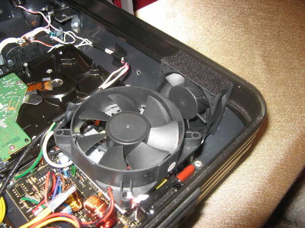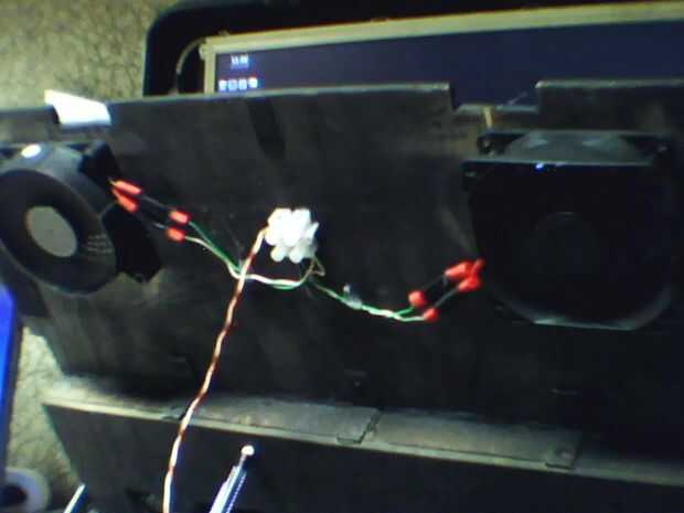 * Instalar dos ventiladores de 80 mm en el resto de palma que expulse el aire de la caja. Los dos ventiladores pequeños en el lado permanecen pero sólo podían mantener la temperatura de cerca de 55 C. Con los dos ventiladores más grandes el caso y las temperaturas son alrededor de 35 C.