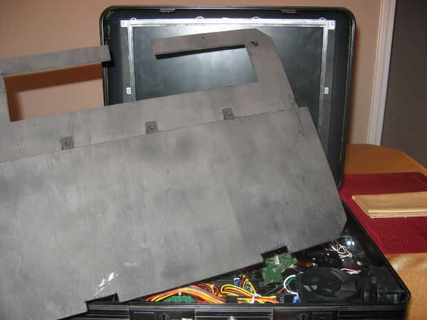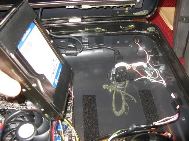 Diseño interior y construcción: Se dedicó más tiempo planeando el diseño del interior que en cualquier otra fase de este proyecto. Hasta ahora estoy satisfecho con el diseño. Las piezas son velcro sería en la parte inferior de la caja por lo que no hay metales tornillos, tuercas o tornillos que sobresalen de la parte inferior que puede dañar el escritorio debajo. Esto también significa que cualquier parte puede ser quitada rápidamente si necesita ser reemplazada. La fuente de alimentación y CPU tienen ventiladores altos y su posición fue determinada por la posición del teclado que está empotrado en la cubierta del resto de Palma. Quería el teclado cerca de la parte posterior para una mudanza cómoda mecanografía y para proporcionar una superficie frontal en la que se puede utilizar un ratón. Esto significó que la motherboard y la fuente de alimentación tuvieron que colocarse hacia la parte delantera. Esto funcionó bien, como hay espacio en la parte trasera para conectar cables a la placa base. Tener los puertos a ras con el lado de la caja era considerado, para que todos eran accesibles desde el exterior, pero esto requeriría el cable VGA que sobresalgan por el lado de la caja. No cableado el cable de alimentación a la pantalla porque tengo planes para hacer la pantalla LCD desmontable y libre de pie. En cambio, se instaló una toma de corriente normal. Los conectores de energía en esta área se cubrirán eventual para proteger al usuario. El disco es montado boca abajo para que el SATA y cables de alimentación no afectan a la placa base. Colocan una etiqueta en la parte inferior de la caja cerca de los puertos que me ayude a recordar lo que son los puertos ya que no se puede ver desde la parte superior. El reverso de la caja tiene un interruptor de poder y pernos que sobresalgan, pero los pies alto evitar de tocar el suelo cuando el caso se puso de pie, esto fue muy afortunado.