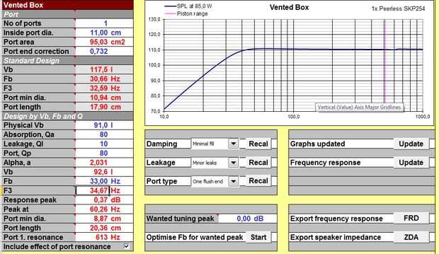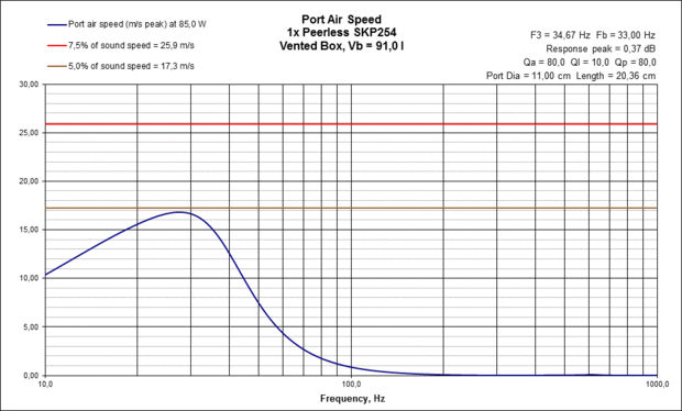 No olvides mirar hacia fuera para la excursión del cono (elegir conductores que tienen suficiente Xmax) y velocidad del aire de puerto. Si es demasiado alta velocidad de aire de puerto necesita utilizar diámetro más largo y más grande puerto.