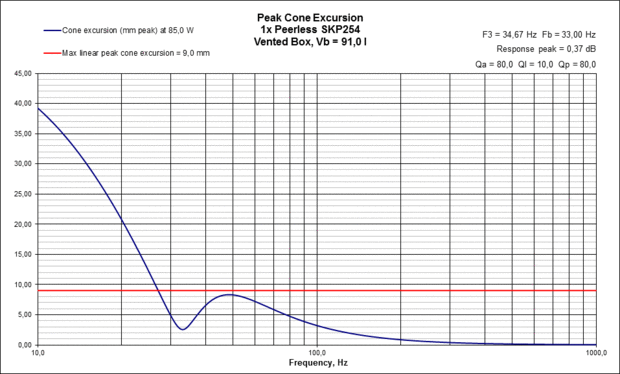 He utilizado L 91 caja tamaño y afinación de 33 Hz. La respuesta simulada estará abajo de 3 dB a 35 Hz y 10 dB a 25 Hz. Esto suena bien en una habitación de tamaño moderado ya que las paredes aumentará significativamente las frecuencias inferiores. No te preocupes si el subwoofer no plano de 20Hz ya que la mayoría de la diversión es de 35-60 Hz en todo caso y muy poco contenido musical está por debajo de la.