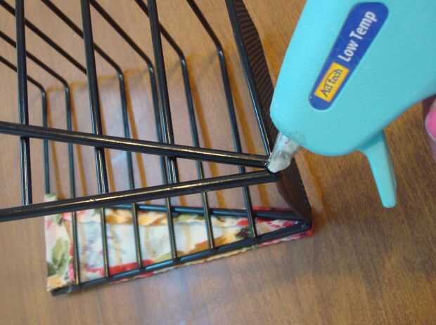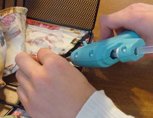 Una vez que se recortan las piezas y se cosen los bordes utilizar tu pistola de pegamento para fijar la tela a la cesta!