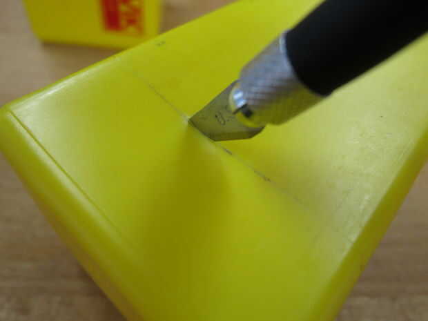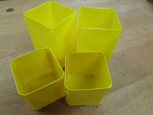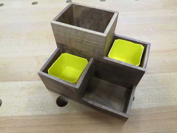 He medido las dos jardineras para ser 1/8" a 1/4" más cortos que los espacios de la jardinera y había marcada con un lápiz. Había medido y marcado dos contenedores más plásticos que las bandejas de drenaje de las macetas. He medido para ser 1/2" alto y había marcado con lápiz.