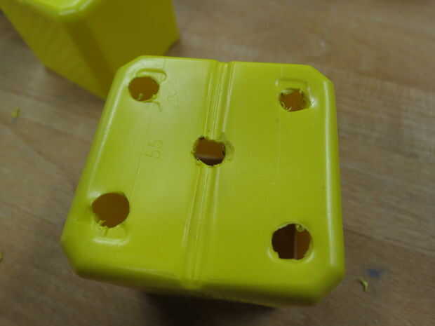 A continuación, perforé 5 agujeros en cada maceta para el drenaje de agua en la bandeja. Usé una 1/4 broca para esto.